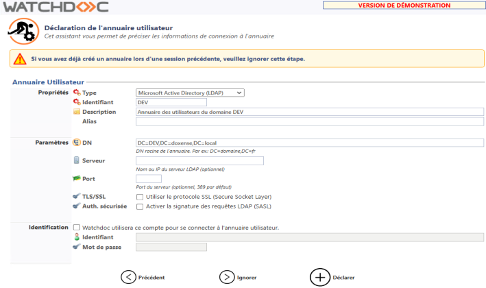 Watchdoc nécessite l'installation d'un annuaire. Cet annuaire peut avoir été installé avant la configuration initiale de Watchdoc. Dans ce cas, passez outre le paramétrage en cliquant sur Suivant.