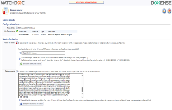 Si vous avez acquis une licence Watchdoc pour l'utiliser au-delà de la période de démonstration, il convient de l'activer.Cette licence repose sur un certificat fourni sous forme d'un fichier avec l'extension .wlk.