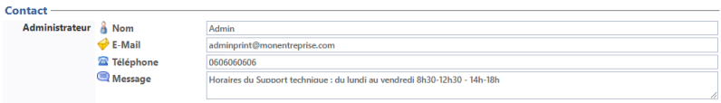 Dans cette section, indiquez les coordonnées du référent Watchdoc qu'il convient de solliciter en cas de problème lors de l'impression. Ces informations apparaissent dans les e-mails ou notifications envoyés aux administrateurs et aux utilisateurs :
