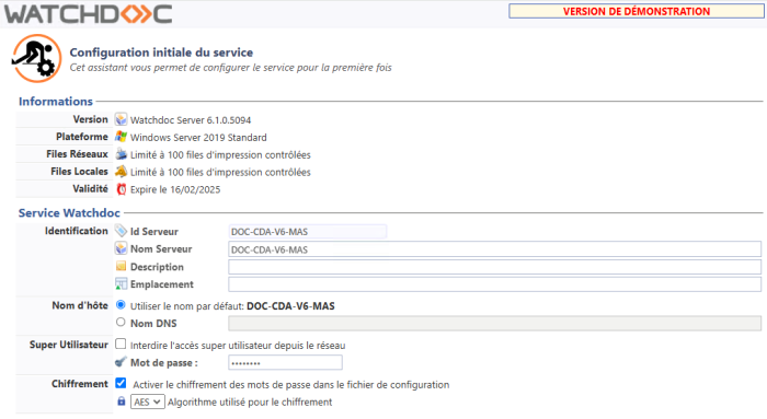 Nom par défaut : c'est le nom défini dans la section précédente qui sera attribué au serveur Watchdoc.