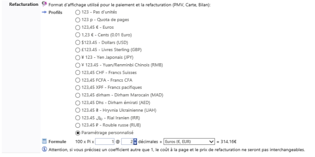 Profils : choisissez le format dans lequel s'affichent les coûts de paiement ou de facturation appliqués à l'impression. Vous avez le choix entre plusieurs formats prédéfinis ou la possibilité de paramétrer votre propre format. Ce format d'affichage est appliqué dans les interfaces Watchdoc informant sur le tarif d'impression (notamment dans les interfaces utilisateur).