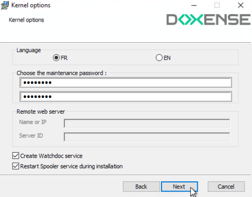 installation de Watchdoc (incluant l'installation des composants kernel et Site web (IIS)).