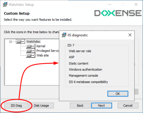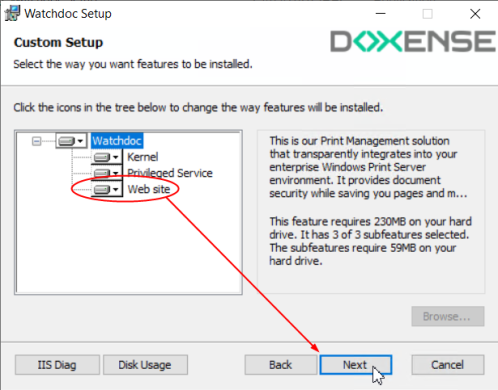 N.B. : Si le composant WebSite est manquant dans la liste, cela signifie que le rôle serveur Web IIS a été mal paramétré. Dans ce cas, cliquez sur le bouton IIS Diag de l'interface Custom Setup pour afficher la liste des composants ISS installés.