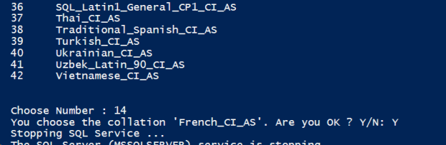 Indiquez ensuite la collation correspondant à la langue choisie et confirmez avant de quitter le script :