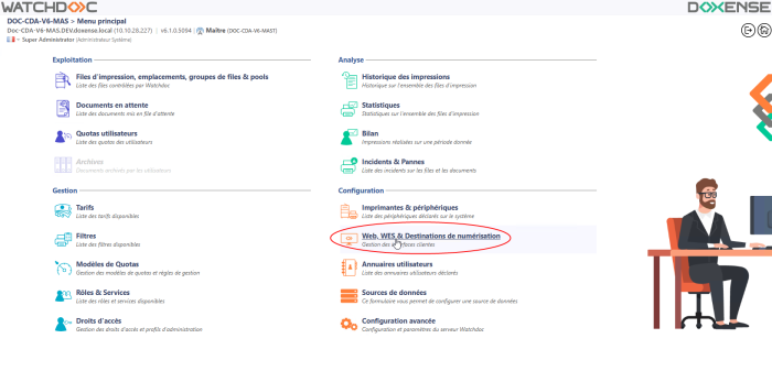 depuis le Menu Principal, section Configuration, cliquez sur Web, WES & Destinations de numérisation :