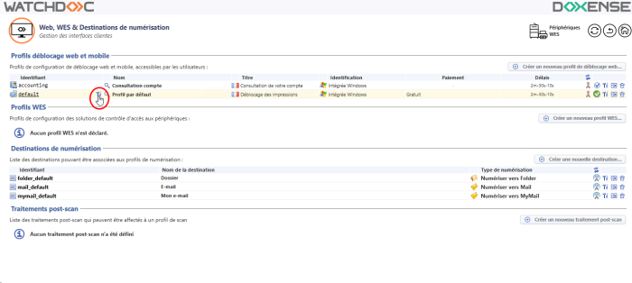 dans l'interface Web, WES & Destinations de numérisation, sélectionnez le profil de déblocage à configurer ;