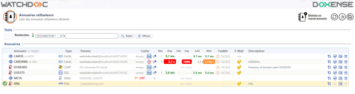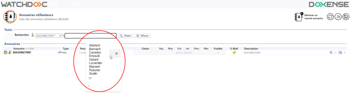 → Vous accédez à la liste des annuaires déclarés pour votre instance Watchdoc constituée de deux sections : Tests et Annuaire :
