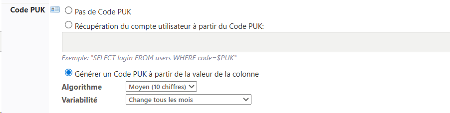 Générer un code PUK : cochez le bouton-radio qui permet à Watchdoc de générer un code PUK à partir de la valeur trouvée dans la colonne login et précisez pour cela l'algorithme utilisé et la variabilité ;