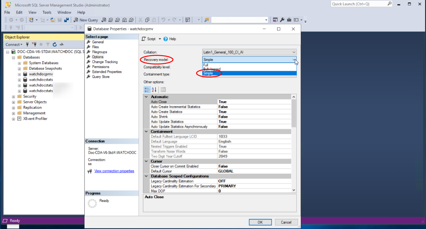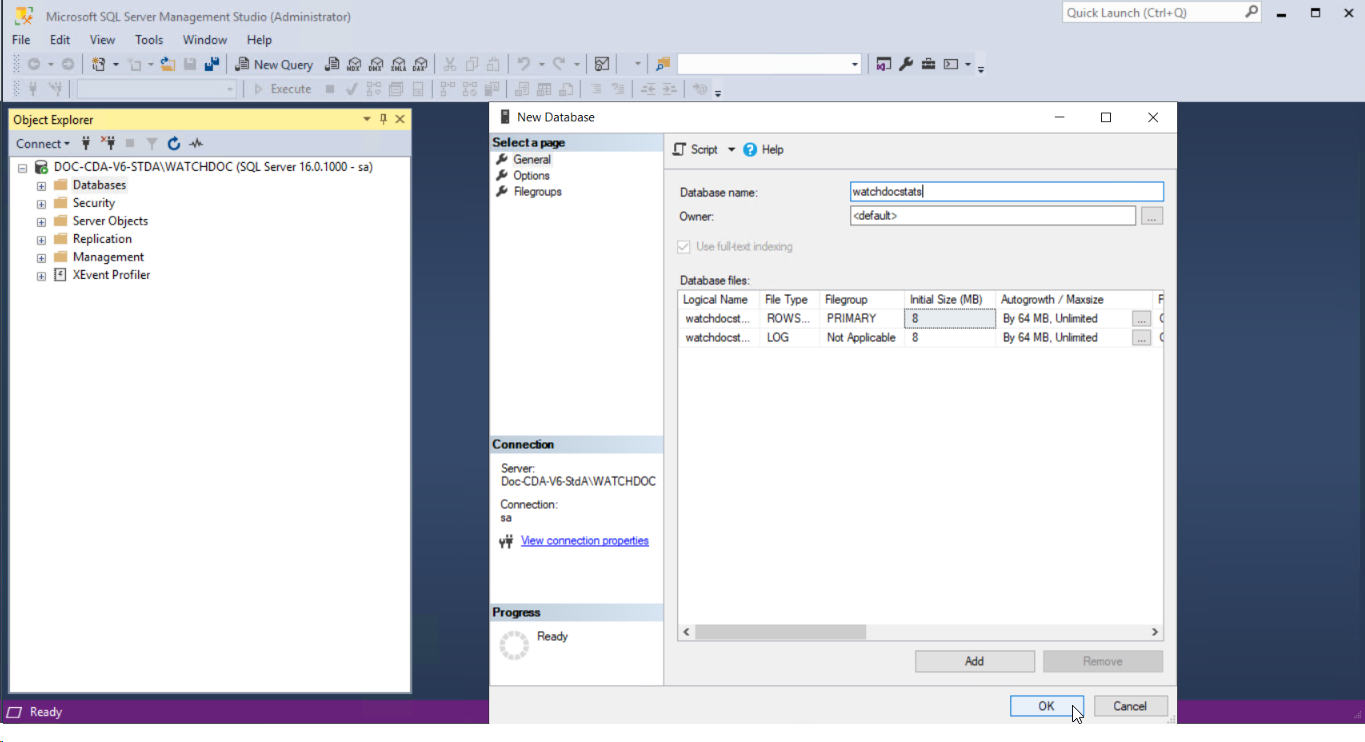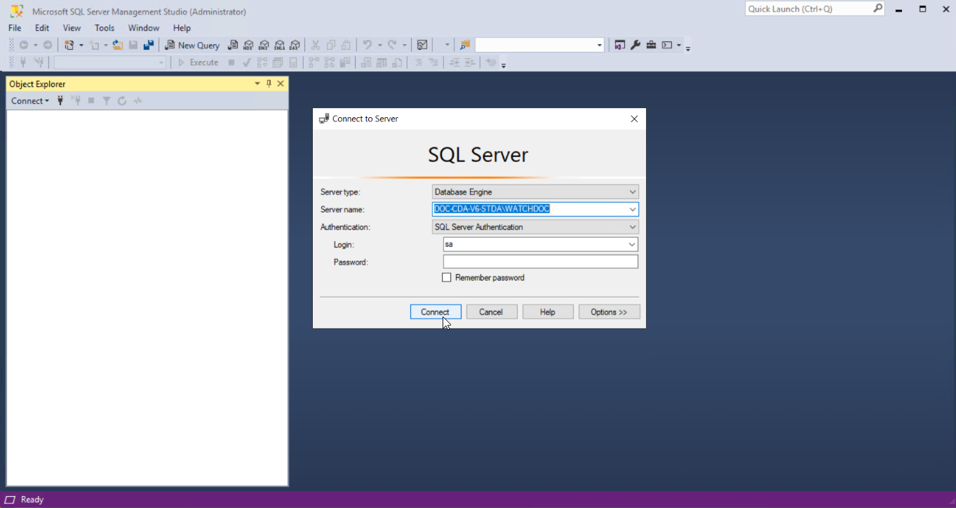 depuis SQL Server Management, connectez-vous au serveur SQLde Watchdoc ;