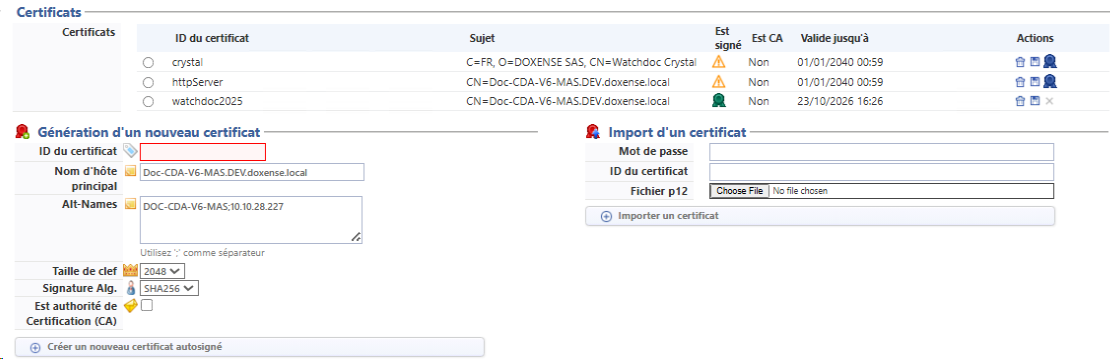 la section Génération d'un nouveau certificat permet de générer un nouveau certificat auto-signé ;