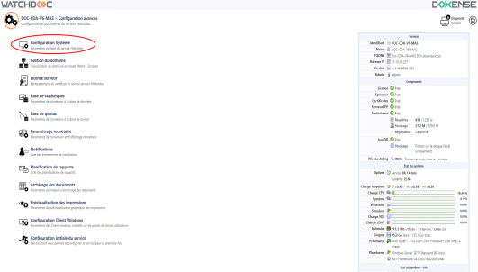 è vous accédez à l'interface Configuration Système de Watchdoc. Une partie des informations qui y figurent sont celles qui ont été saisies lors de l'installation de Watchdoc figurant également dans l'interface Configuration initiale du service.