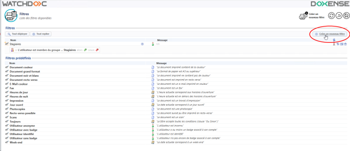Vous accédez à la liste des filtres déclarés et filtres prédéfinis (cf. liste des filtres prédéfinis en annexe) par défaut dans Watchdoc.