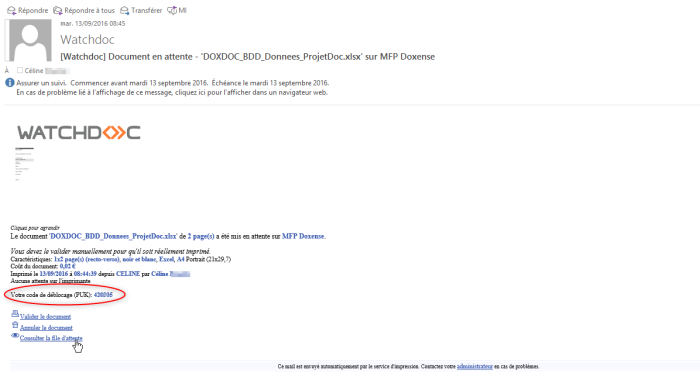 Ci-dessous, le e-mail correspondant à l'événement "Document en attente ( $JOBSPOOLED)" est envoyé lorsqu'un usager a lancé une impression et qu'il doit la valider :