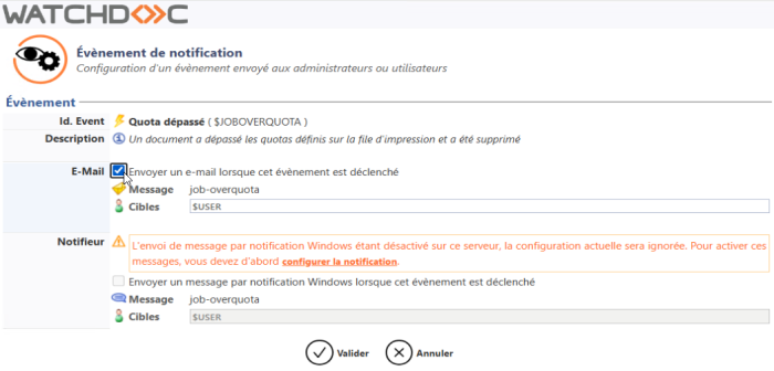 Pour vérifier que la notification fonctionne, reproduisez l'événement censé déclencher l'envoi de l'e-mail ou de la notification MS Windows : par exemple, tentez d'imprimer alors que votre quota est dépassé ou tentez de numériser un document qui dépasse le poids autorisé).