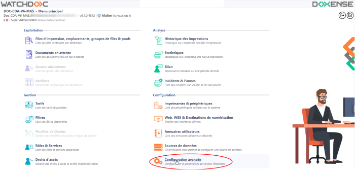 1. Depuis le Menu principal de l'interface d'administration, dans la section Configuration, cliquez sur Configuration avancée :