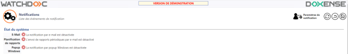 • La section Etat du système affiche les 3 modes d'envoi des notifications disponibles pour Watchdoc et indique, pour chacun, s'il est activé ou désactivé :