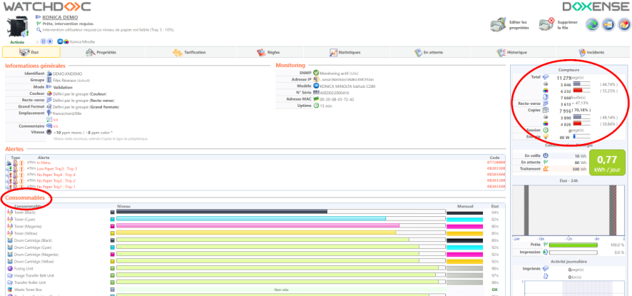 dans l'interface Etat de la file sélectionnée, vérifiez que des informations relatives aux compteurs et consommables sont collectées :