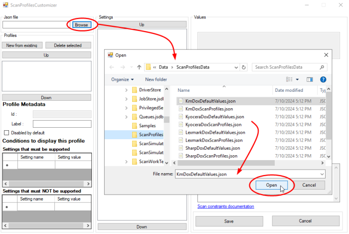 Dans la section JSon File, cliquez sur Browse pour parcourir la liste des profils existants ;