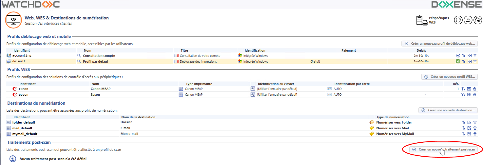 dans l'interface Web, WES & Destinations de numérisation, dans la section Destinations de numérisations figurent les traitements post-scan créés.