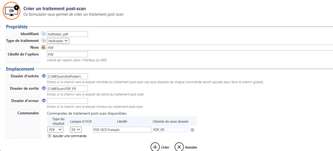Dans l'interface Créer un traitement post-scan, complétez :