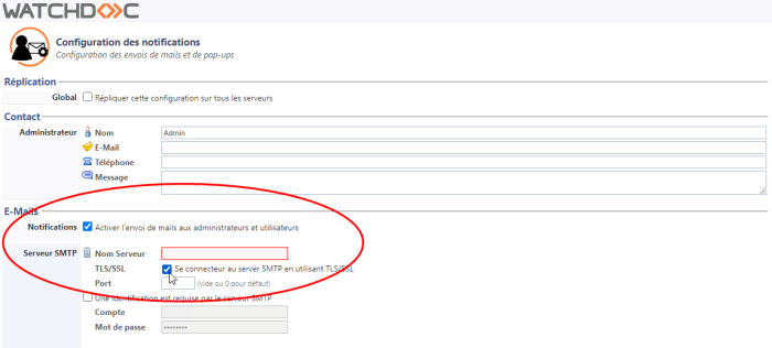 Notification par mail : il est nécessaire d'activer la notification par e-mail pour le serveur Watchdoc (depuis le Menu Principal de Watchdoc > section Configuration > Configuration avancée > Notifications > Configuration des notifications > section E-Mails) :