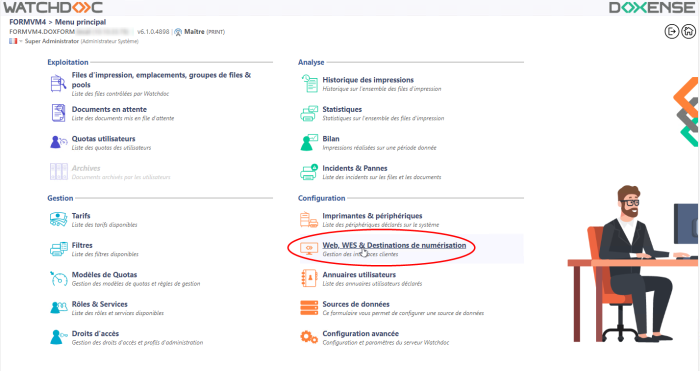 Depuis le Menu principal de l'interface d'administration, dans la section Configuration, cliquez sur Web,WES & Destinations de numérisation :