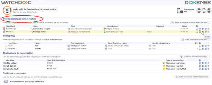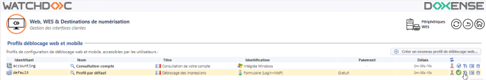 La liste Profils de configuration des instances de déblocage web et mobile affiche l'ensemble des interfaces déclarées dans l'application Watchdoc :