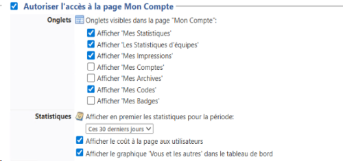 Lorsque la case Mon Compte est cochée, les sections Paiement, Accès aux détails d'une impression, Accès aux informations d'une file d'impression et Autoriser le rechargement des comptes sont désactivées.
