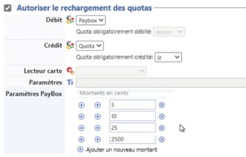 Paramètres PayBox : si les supports fonctionnent avec la solution PayBox®, précisez les montants mis à disposition des utilisateurs pour recharger leur quota.
