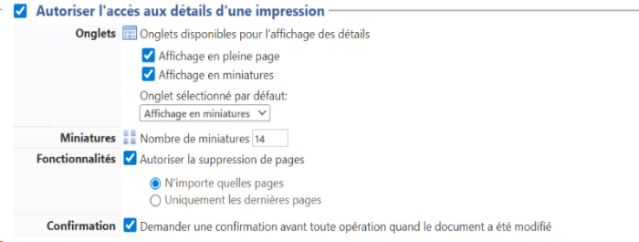 Confirmation : cochez cette case pour demander une confirmation à l'utilisateur avant toute opération sur ses demandes d'impression :