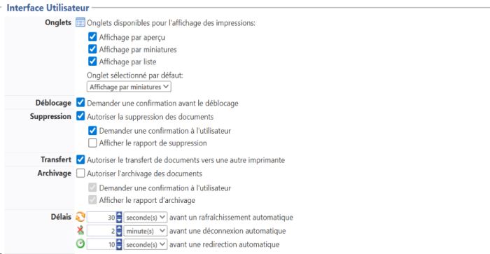 Déblocage - demander une confirmation avant le déblocage : lorsqu'aucun paiement n'est attendu pour l'impression (Paiement = mode Gratuit), précisez si le document est automatiquement imprimé après demande d'impression ou si l'utilisateur doit confirmer son impression en la débloquant explicitement.