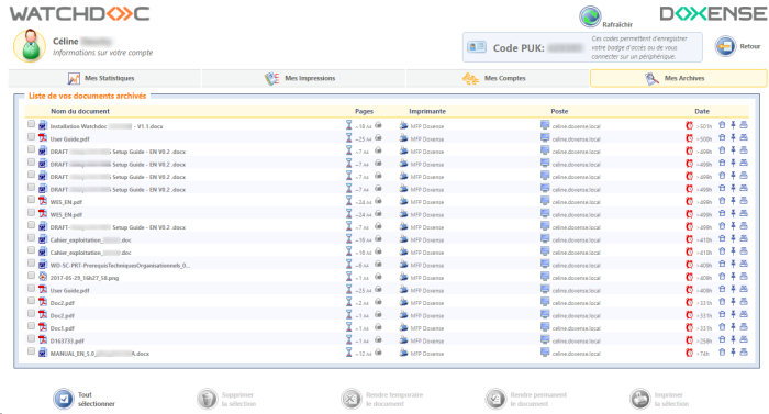Onglet Mes Archives: permet à l'utilisateur d'accéder aux travaux d'impression qui ont été archivés :