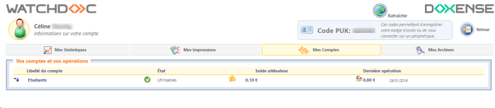 Onglet Mes comptes : permet à l'utilisateur d'accéder à la synthèse de son (ou ses) compte(s) et de son solde, dans le cas où les impressions sont soumises à quotas :