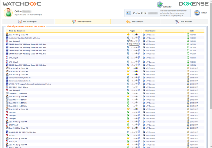 Onglet Mes impressions - Historique de vos derniers documents : permet à l'utilisateur d'accéder à l'historique de ses 50 derniers travaux (impression, numérisations, photocopies et fax).