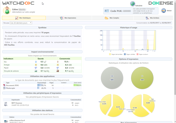 Onglet Mes statistiques : permet à l'utilisateur d'accéder à une synthèse de son utilisation ainsi qu'à l'impact environnemental de son activité d'impression d'une période choisie.
