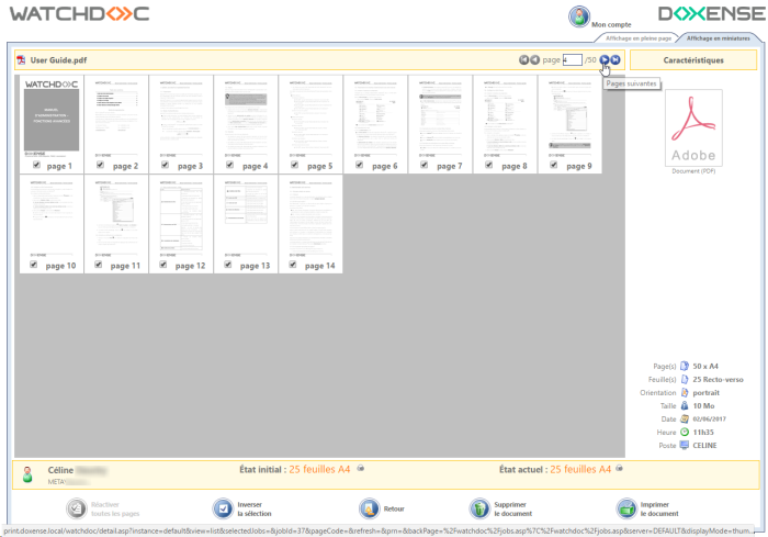 par miniature : interface dans la quelle le document à imprimer est présenté, sous forme de miniatures, avec des outils de pagination permettant de le parcourir entièrement :