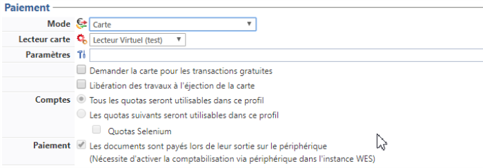 Activer le paiement sur le périphérique nécessite d'avoir configuré la comptabilisation sur le profil WES correspondant.
