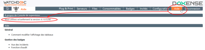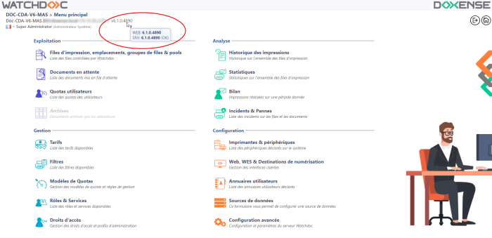 Dans la page d'accueil de l'interface web d'administration de Watchdoc, vérifiez que le numéro de version a été mis à jour :