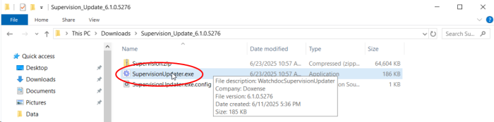 Dans le dossier où les fichiers ont été décompressés, double-cliquez sur SupervisionUpdater.exe pour lancer l'exécutable de mise à jour :