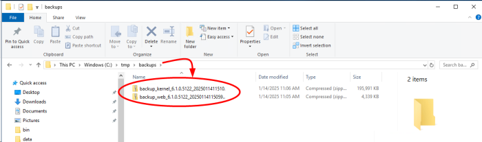 une fois la mise à jour effectuée, rendez-vous dans le dossier de sauvegarde indiqué pour vérifier que les fichiers backup_kernel_[n°version_date].zip et backup_web_[n°version_date].zip y figurent :