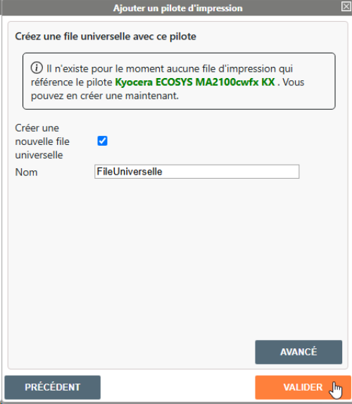 depuis l'interface Créez une file universelle avec ce pilote, cliquez sur le bouton Avancé ;