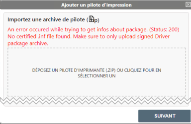Si vous tentez d'ajouter un package de pilote non-conforme aux attentes de WSC, un message d'erreur s'affiche dans l'interface Ajouter un pilote d'impression : No certified .inf file found.