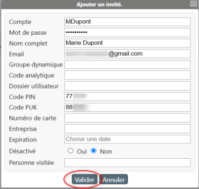 Code analytique : si nécessaire, indiquez un code analytique permettant d'associer l'invité à un compte spécifique afin de faciliter l'analyse de ses coûts d'impression (cf. Codes analytiques).