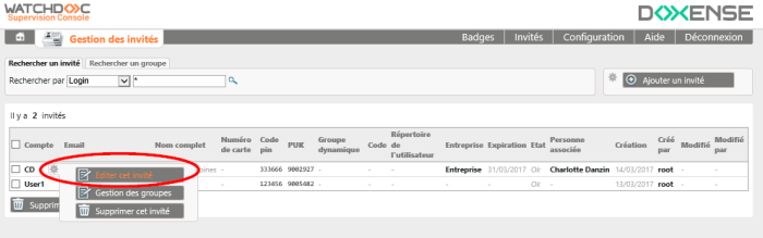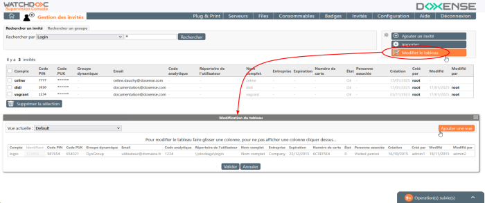 Dans l'interface Gestion des invités, les invités déjà enregistrés sont affichés :