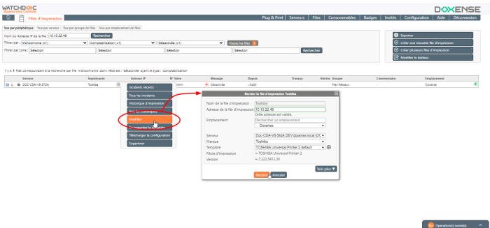 Depuis l'interface de gestion des files d'impression WSC, dans la liste des files, cliquez sur le bouton situé à droite du nom de la file à modifier ;