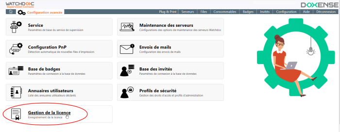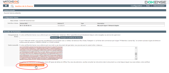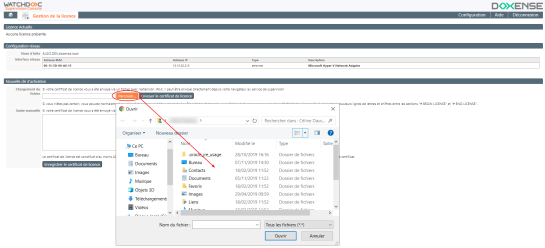 [Etape supprimée le 23/10/2023 pour la version Watchdoc V6 dans laquelle il n'est plus nécessaire dedisposer d'une licence spécifique à WSC] dans l'interface Gestion de la licence, cliquez sur le bouton Parcourir, pour sélectionner le fichier de licence fourni par Doxense® ;