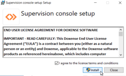 dans l'interface Watchdoc Supervision Console setup, lisez les conditions, cochez la case pour accepter les conditions, puis cliquez sur le bouton Install :