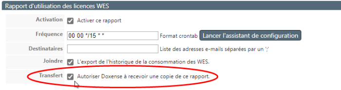 Transfert : cochez cette case pour que le rapport relatif aux licences WES de votre parc soient également transmis à Doxense® via l'adresse contact@doxense.com.