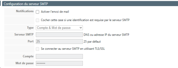 Dans cette section, paramétrez le serveur SMTP sur lequel repose la fonction d'envoi de mails :