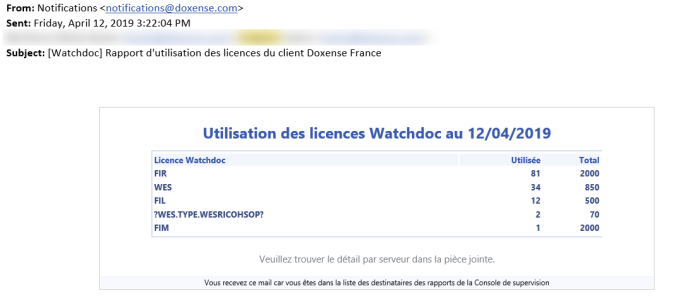 A la fréquence fixée, le destinaire reçoit le rapport d'utilisation des licences Watchdoc :